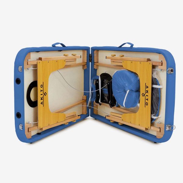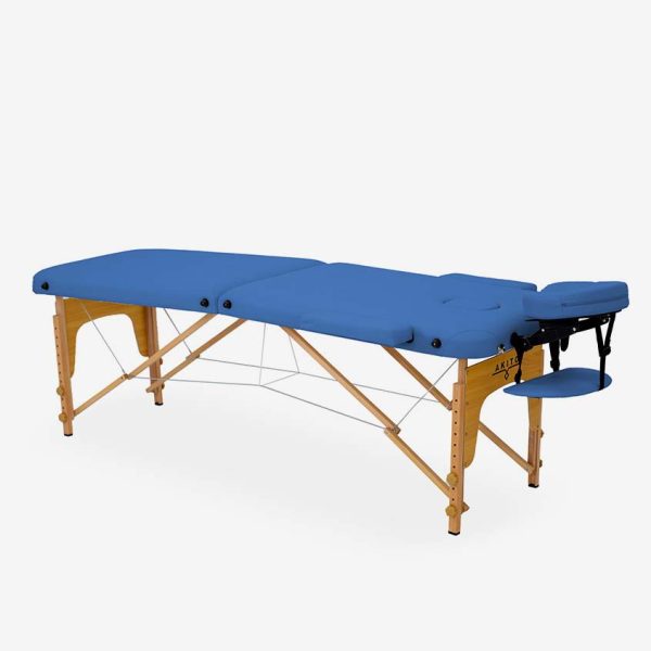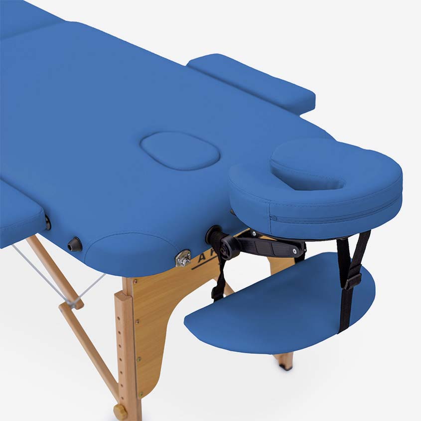Odlična lesena prenosna dvodelna masažna miza je vrhunski izdelek v svojem razredu. Njena glavna prednost je močan in trpežen lesen okvir. Zahvaljujoč jeklenim žicam in dvema varnostnima zatičema na vsaki opori za noge, je masažna miza sposobna prenesti težo do 250 kg. Zaradi visokokakovostnega ekološkega usnja “Skin Touch” je miza odporno na vodo in olje ter je uporabna za vse vrste masaž. Zaradi polnila iz mehke 50-mm debele dvoslojne pene je površina res prijetna in mehka na otip. Veliko udobje zagotavlja tudi nastavljiv naslon za glavo, dva stranska naslona za roke ter viseč nosilec za roke. Masažna miza ima tudi zložljiv sistem z ročajem za enostavno shranjevanje in transport. Masažna miza je zaradi lesenega okvirja in vseh zgoraj navedenih lastnosti primerna tako za domačo kot profesionalno uporabo.