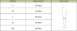 Zelo pomembno je, da izmerite obseg iztegnjenega kolena (preko sredine pogačice). Ne merite stegna! Noga naj bo iztegnjena pod kotom 180° (glejte sliko). Če so vaše mere na mejni vrednosti, izberite večjo številko.