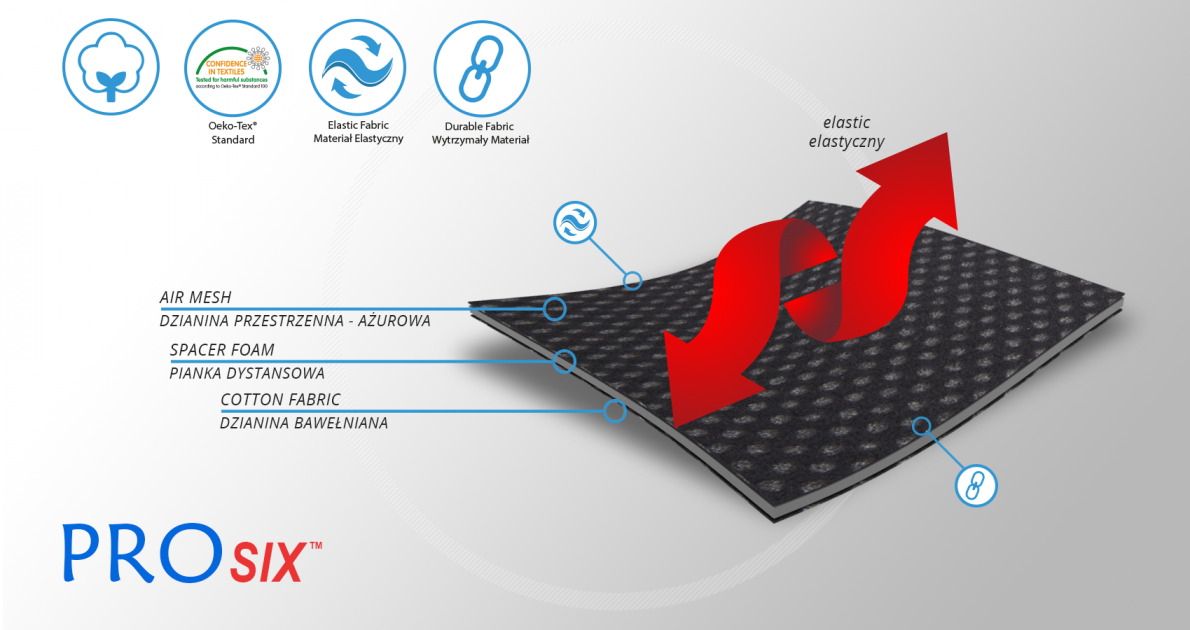 Opornica je narejena iz ProSix™ inovativne 3D tkanine, ki je elastična v vseh smereh in se natančno prilega okončini. Zunanja plast je iz 3D materiala, ki zagotavlja odlično stabilizacijo. V notranjosti je dvoslojna tkanina, ki zagotavlja visoko prepustnost zraka in kompresijo. Koža je v stiku z bombažem, ki je zračen in mehak. ProSix™ je prijazen in nevtralen do kože ter ima certifikat Oeko-Tex Standard 100. Opornica je opremljena tudi z dvema paroma VELCRO trakov in dvema stranskima oporama z nastavljivim zglobom. Stranske opore so izdelane iz visokokakovostnega poliamida in karbonskih vlaken. Opornica ima prav tako vgrajen anatomsko oblikovan silikonski vložek, ki zagotavlja razbremenitev in stabilizacijo pogačice.