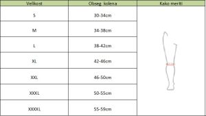 Zelo pomembno je, da izmerite obseg iztegnjenega kolena (preko sredine pogačice). Ne merite stegna! Noga naj bo iztegnjena pod kotom 180° (glejte sliko). Če so vaše mere na mejni vrednosti, izberite večjo številko.